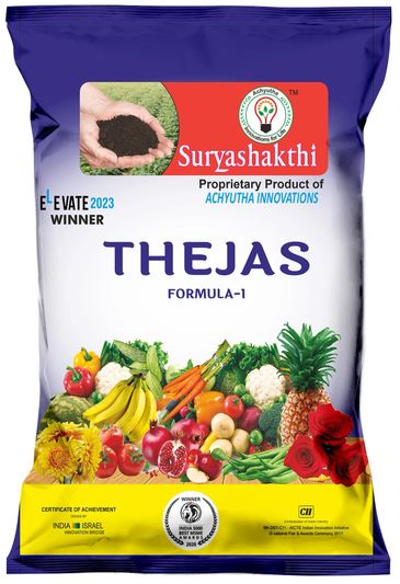 Dissolve 500gms of Thejas in 100 liters water / 1Kg Thejas in 200 liters of water, mix well and apply 2 liters per plant for 3 years and less old plant, 3 liters for 4 to 6 years and 4 liters for above 6 years old plant for fruit crops. Apply by forming a trench or a shallow pit with 2 liter volume at 1 and ½ a foot away from the plant trunk / stem for best results.